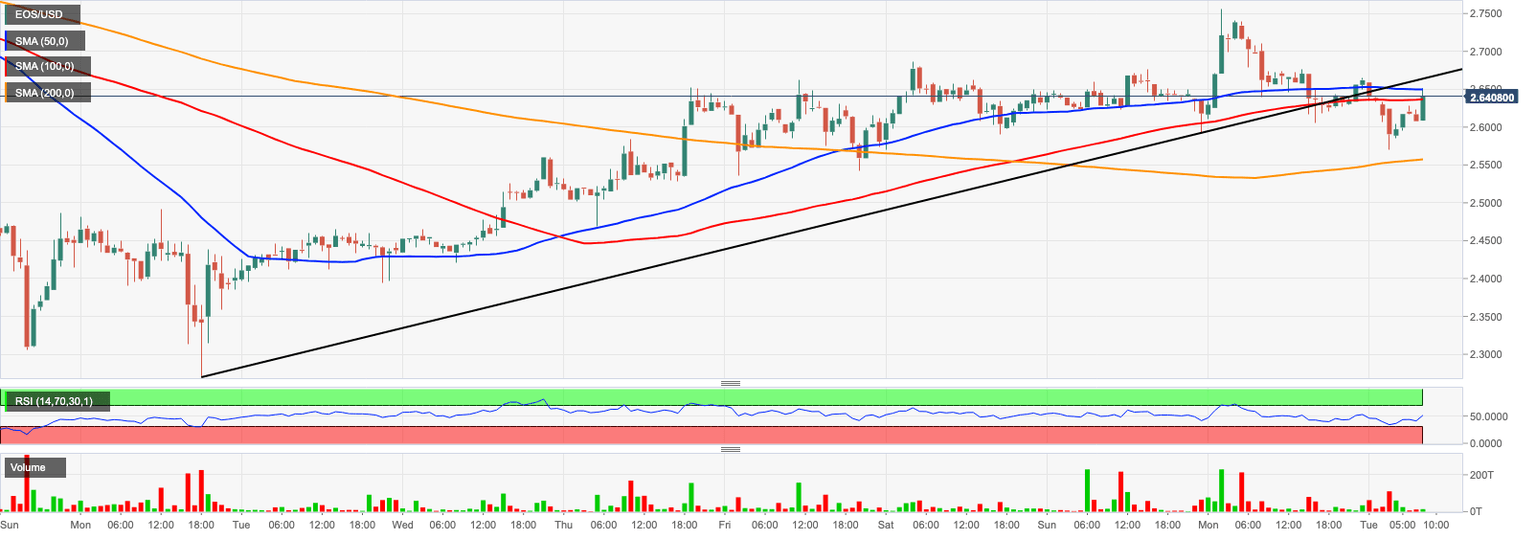 At the time of writing, EOS/USD is changing hands at $2.63, off the intraday low of $2.57. The coin broke below local support created by 1-hour SMA50 (currently at $2.65) and the short-term upside trendline. Now this area serves as resistance and separates the price from an extended recovery.