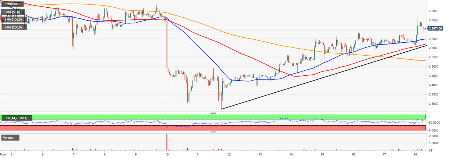 EOS/USD found strong support at daily SMA50 (currently at $2.6). This area has been limiting the decline since May 15 and served as a jumping-off ground during early Asian hours on Monday. At the time of writing, EOS/USD is changing hands at $2.70, off the intraday high of $2.75.