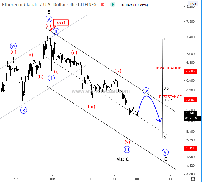 ETCUSD can be trading in a big, bearish decline labelled as a wave C, down from 7.58 high. Wave C is an impulse, therefore five legs are needed, before price may see a low, and a bullish reversal. At the moment we see price making a rally from the 5.29 level, which can be part of a corrective sub-wave iv of C, and can see potential resistance/bearish turn at the 6.0/6.2 region. That said, a completed corrective rally in sub-wave iv of C, and a sharp drop towards the 5.4 level would indicate a sub-wave v of C underway.