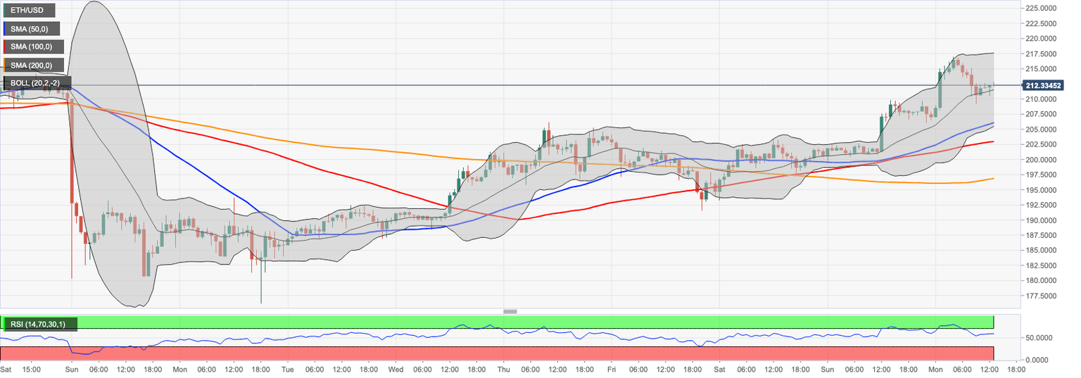 ETH/USD is changing hands at $212.74, off the intraday high at $216.97. The second-largest digital asset is moving within the short-term bullish trend in sync the market. The local support is created by a 1-hour SMA50 on approach to $206.00. Once it is out of the way, the sell-off is likely to gain traction with the next focus on 1-hour SMA100 at $203.00.
