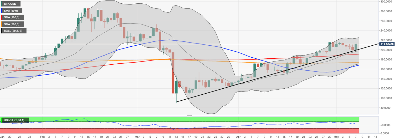 - ETH/USD bulls aim at $220.00, which is the nearest pivotal resistance.
