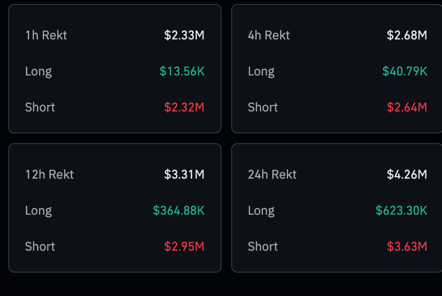 Meanwhile, liquidations in the derivatives market reached approximately $4.2 million in the last 24 hours. Short position holders accounted for the lion’s share of the liquidations, with around $3.63 million wiped out compared to roughly $623,000 in longs. The increase in short position liquidations underscores Ethena’s bullish case.