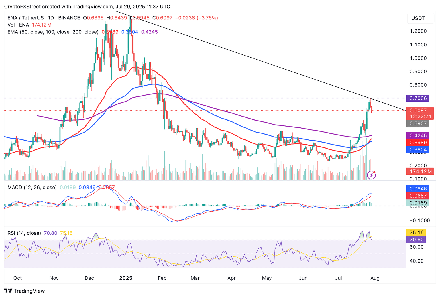 Ethena (ENA) price remains suppressed for two consecutive days, trading at $0.60 at the time of writing on Tuesday. The synthetic dollar protocol built on Ethereum (ETH) has extended the decline 15% below its recent peak of $0.70.