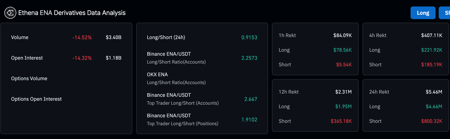 Low funding rates imply fading bullish sentiment as fewer traders bet on the ENA price increasing. This, coupled with a 14% decline in the derivatives market’s Open Interest, indicates a lack of conviction in the uptrend’s continuation. Fewer traders are seemingly betting on the ENA price reaching higher levels.