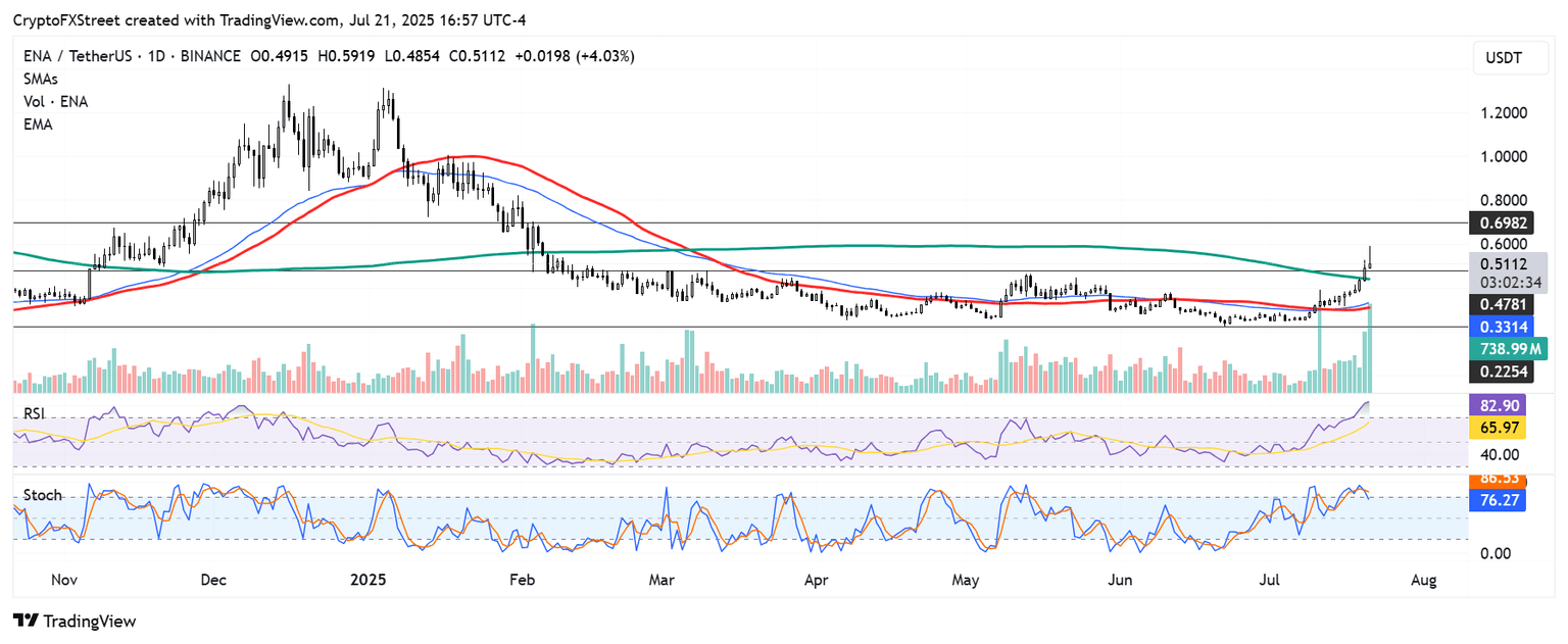 ENA rose 3% in the past 24 hours following the announcement. The altcoin has surged above its 200-day Simple Moving Average (SMA) and the $0.478 resistance. If ENA holds this level as support, it could stretch its rally to the next key level at $0.698.