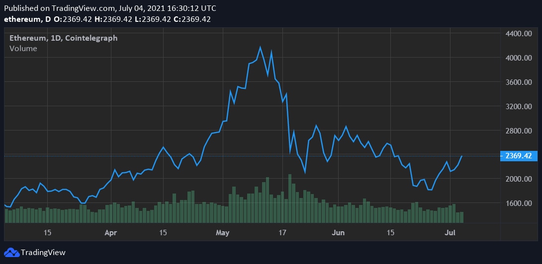 ETH rose more than 6.5% to $2,370 on Sunday, the highest in over two weeks, according to Cointelegraph Markets Pro. Weekend trade volumes remained characteristically low at just over $18 billion.