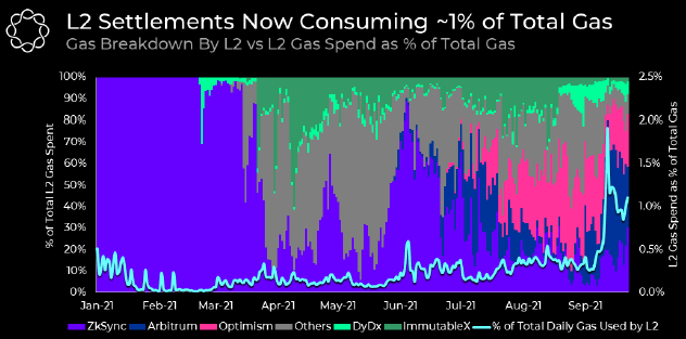 Data from Delphi Digital shows that the percentage of gas used by layer-two solutions is now above 1% after spiking as high as 2% in early September.