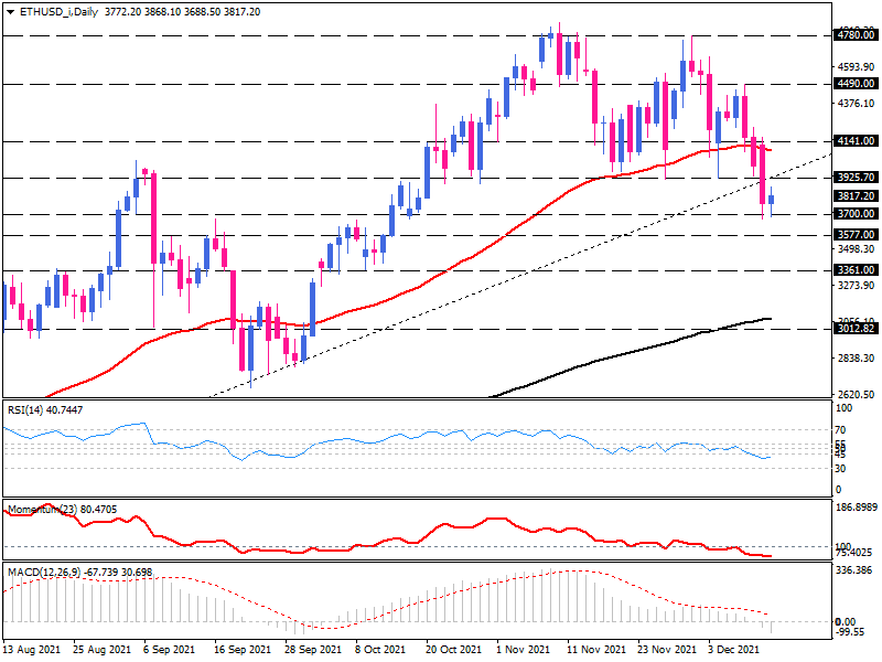 Ethereum has recently retreated from its all-time highs around 4780, and now faces the psychological block of 3700, which is proving difficult to overcome shortly. It is likely that bulls will defend this support level, and for now, they will try to bounce back and retest the broken uptrend line, which is located near the 3925-barricade.