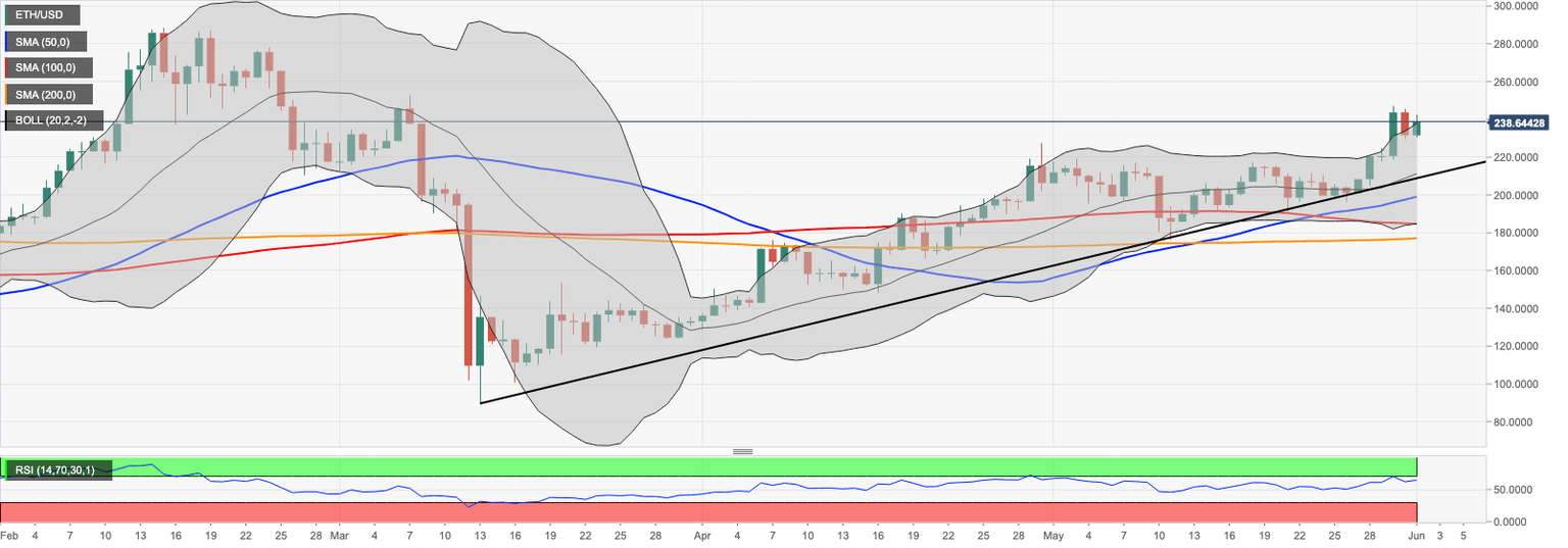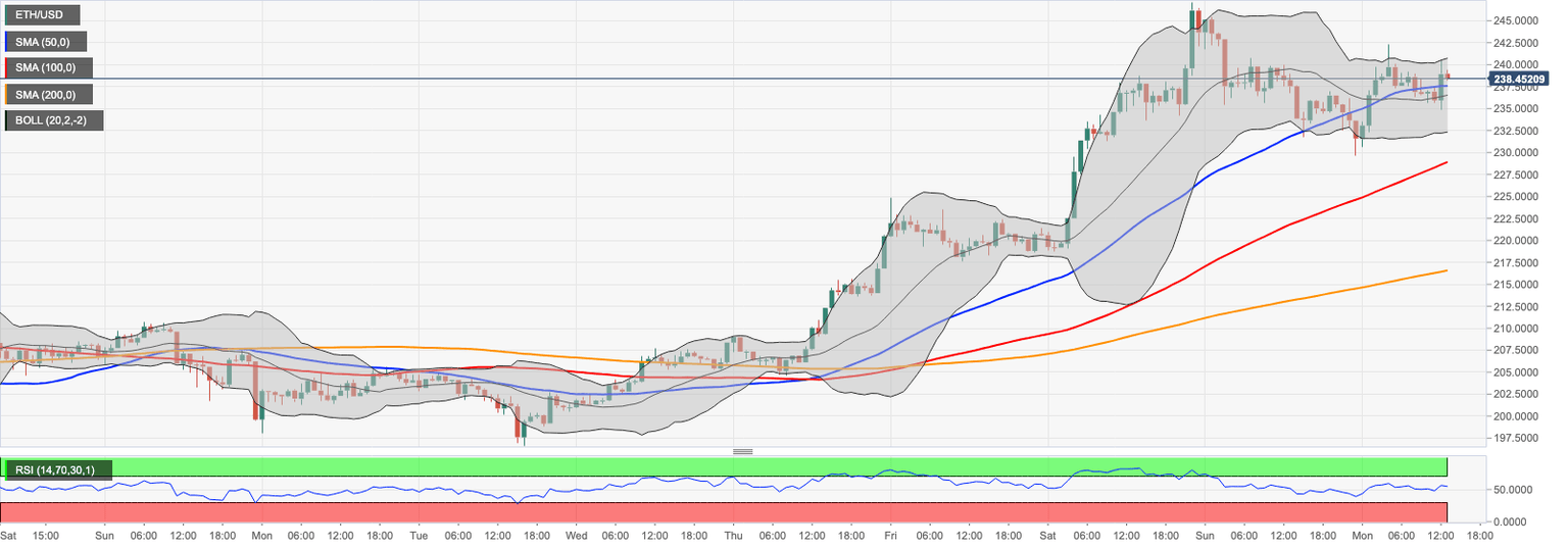 On the intraday chart, ETH/USD moved above 1-hour SMA50 at $237.00, however, the further upside may be limited by the upper boundary of the short-term consolidation channel at $240.00. This resistance has been verified a couple of times since the start of the day, which means ETH bulls may struggle at this barrier. Once it is out of the way, the upside is likely to gain traction with the next focus on $247.15. This is the recent recovery high that separates the price from psychological $250.00.