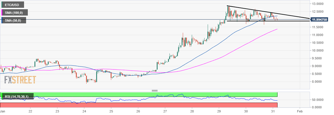 At the time of writing, ETC is trading at $11.98 after a bearish correction from weekly highs of $12.86. Its immediate upside is limited by the 50 SMA on the 1-hour chart. On the other hand, the downside is supported by a falling triangle’s support.