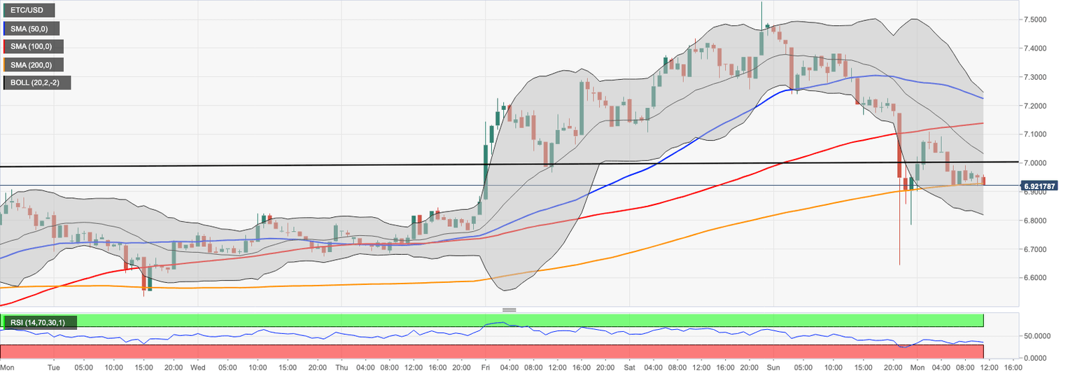 ETC/USD dropped to $6.64 after the fork; however, by the time of writing, the coin regained some ground to trade at $6.92. The coin is moving inside a short-term upward-looking channel created by 1-hour SMA200 ($6.90) on the downside and SMA100 ($7.14) on the upside. a sustainable move above this area is needed for the upside to gain traction. And allow for a move towards $7.56, the recent recovery high.
