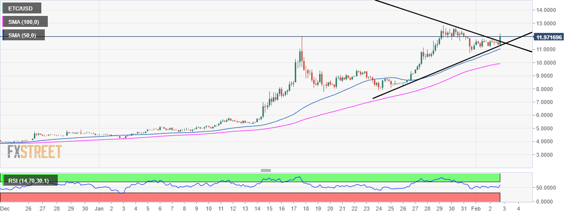 - Ethereum Classic bulls struggle to sustain the recent triangle resistance breakout towards $13.00.