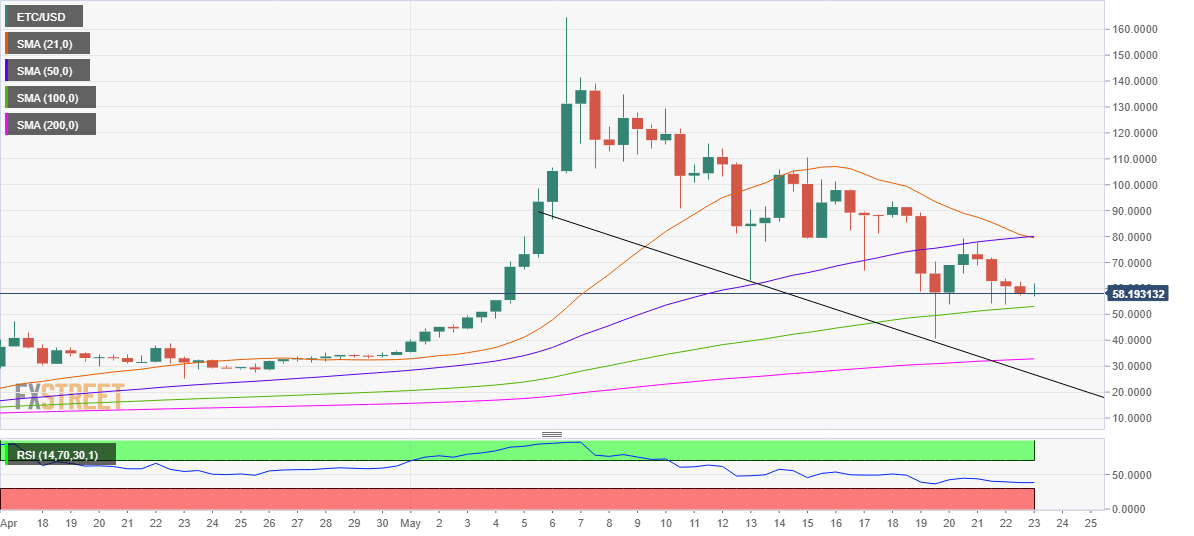 The ETC price has managed to defend the upward-sloping 100-simple moving average (SMA) at $53.05 following a recovery from the flash crash.