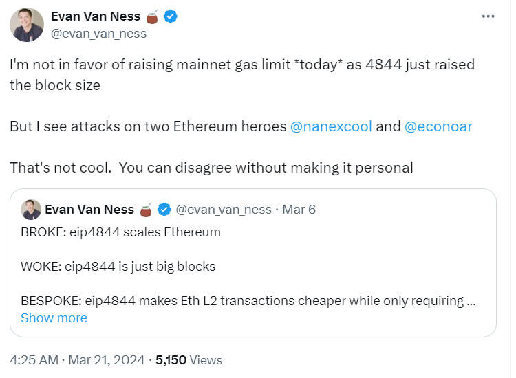 However, not all are in favor of this network adjustment. Venture investor and Ethereum advocate Evan Van Ness said, “I'm not in favor of raising mainnet gas limit *today* as EIP-4844 just raised the block size,” in a post on X.