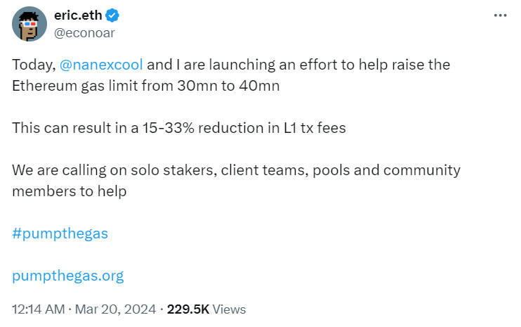 “This can result in a 15% to 33% reduction in layer-1 transaction fees,” said Connor in a March 19 post on X before adding, “We are calling on solo stakers, client teams, pools, and community members to help.”