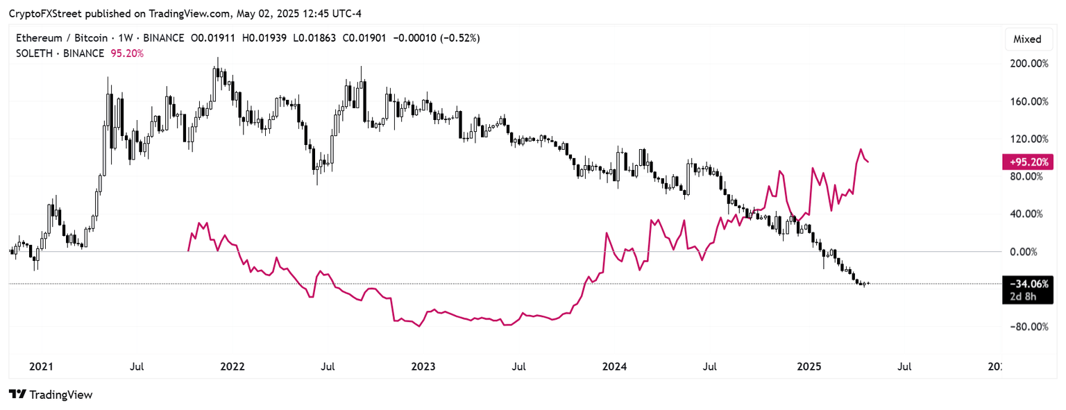 This follows the ETH/BTC ratio plunging to all-time lows while SOL/ETH rallied to new all-time highs. The top altcoin's underperformance of Solana and Bitcoin stems from several developments in the crypto market over the past year.