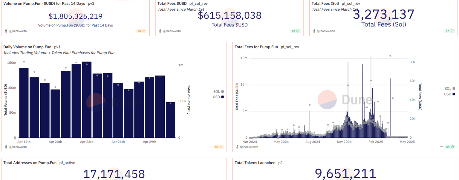 Pumpfun key metrics. Source: Dune (@jhackworth)