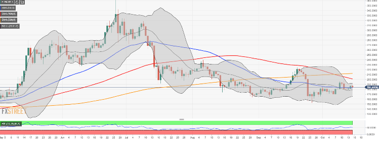 ETH bottomed at $152.50 on September 26 and managed to claw back some ground. However, the upside momentum has faded away on approach to the next critical resistance area of $190.00-$200.00. At the time of writing, ETH/USD is changing hands at $183.90, down 1.5% since the beginning of the day and mostly unchanged on a day-on-day basis. The second-largest con with the current market value of $19.8 billion has been range-bound recently, moving in sync with the market.