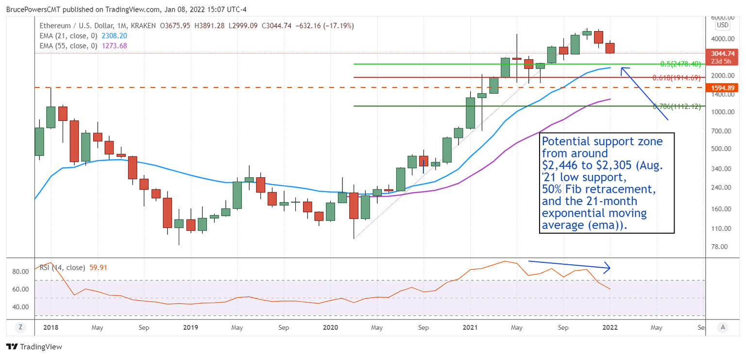 Ethereum has dropped approximately 38% off its most recent high, while Bitcoin declined as much as 41%. If Ether's October $2,970 low is breached, this crypto could easily reach the next more significant support zone from around $2,446 to $2,305, as seen in the enclosed monthly chart. That price zone includes the Aug. '21 low support, 50% Fib retracement, and the 21-month exponential moving average (EMA).
