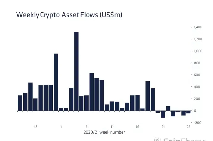 - “Since mid-May, as negative sentiment has remained prevalent, net weekly outflows now total $313 million," representing 0.8% of total assets under management (AUM), according to CoinShares.