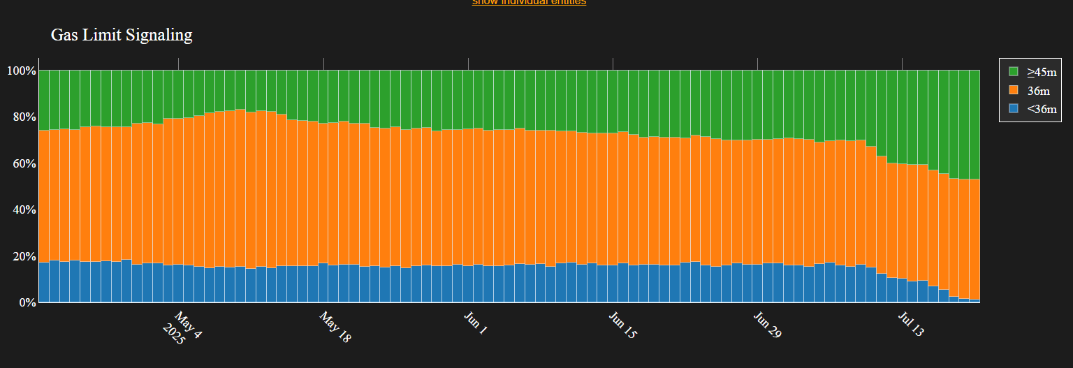 The weekend gas limit increase came as nearly half of all staked Ether (ETH $3,793) is now signaling support to raise the gas limit to 45 million or higher through a grassroots “pump the gas” campaign.
