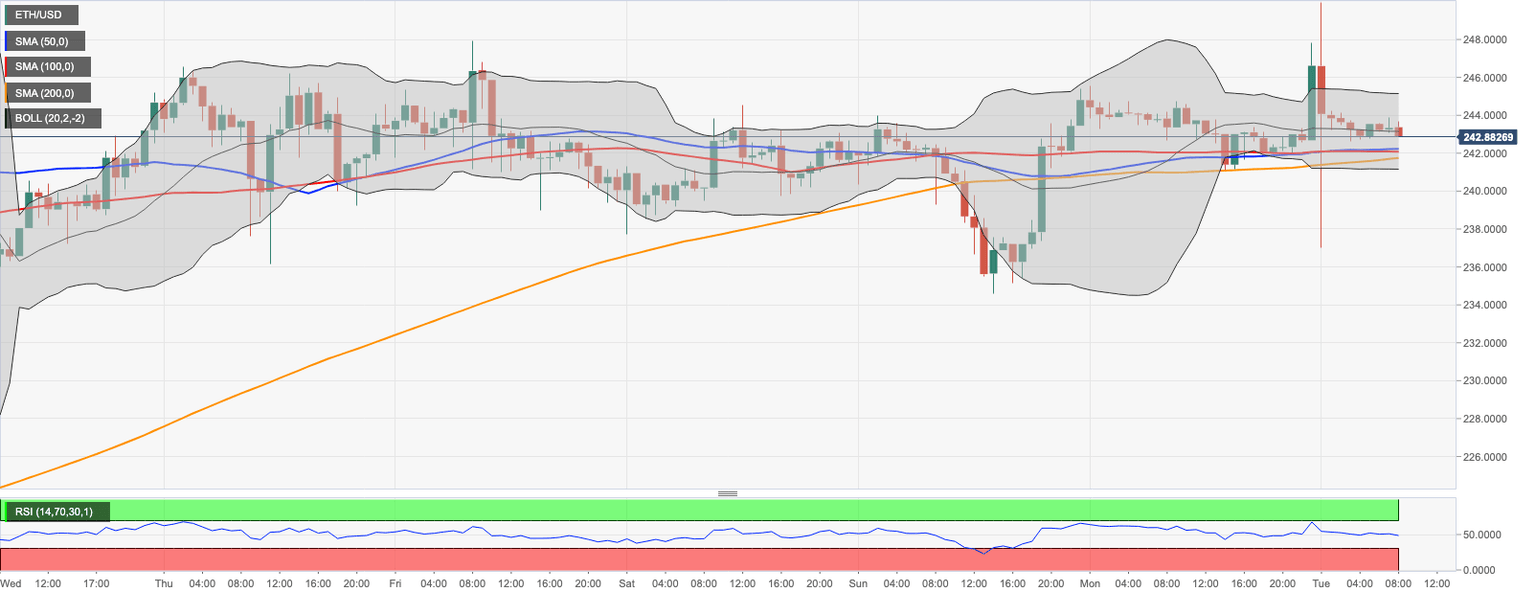 Ethereum's ETH is changing hands at $243.50, down 1.25% since the beginning of the day and mostly unchanged on a day-to-day basis. The second-largest digital asset with the current market value of $27 billion has been range-bound recently after a failed attempt to clear $250.00