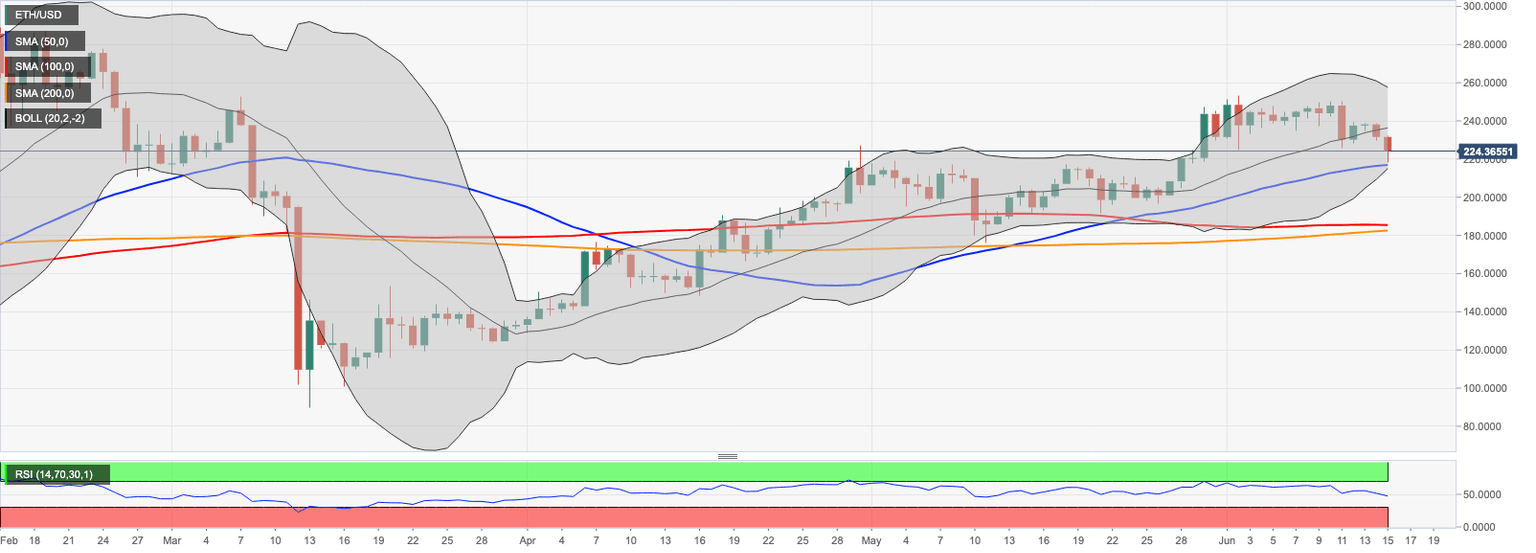 On a daily chart, ETH/USD is supported by daily SM50 at $217.00. Once it is out of the way, the downside is likely to gain traction with the next focus on psychological $200.00 followed by a combination of daily SMA100 and SMA200 At $185.00. On the upside, a sustainable move above $240.00 is needed for the upside to gain traction. However, the downward-looking RSI on a daily chart implies that the bearish scenario is more likely at this stage.