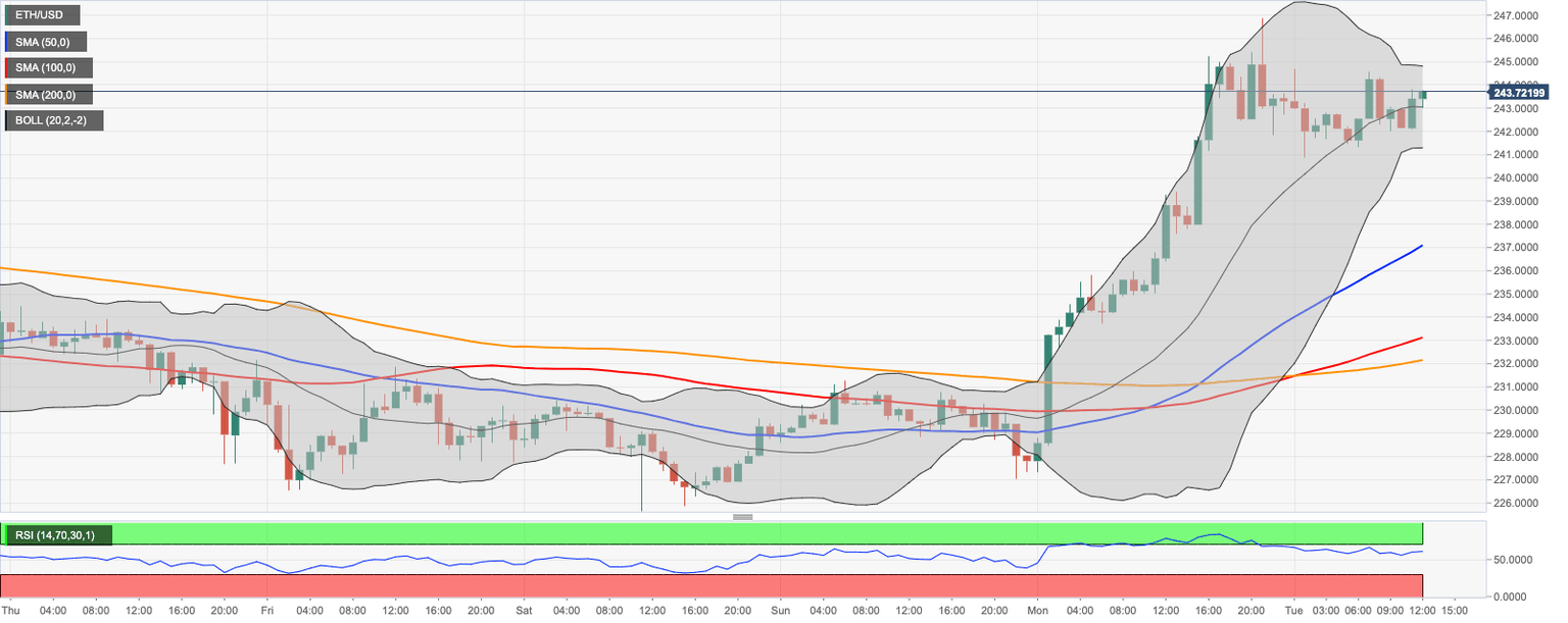 ETH/USD settled above $243.00 after a short-lived jump above $244.67 on Monday. The second-largest digital asset has gained nearly 3% in the recent 24 hours and stayed unchanged since the start of the day. At the time of writing, ETH/USD is moving withing a short-term downside trend amid low volatility.