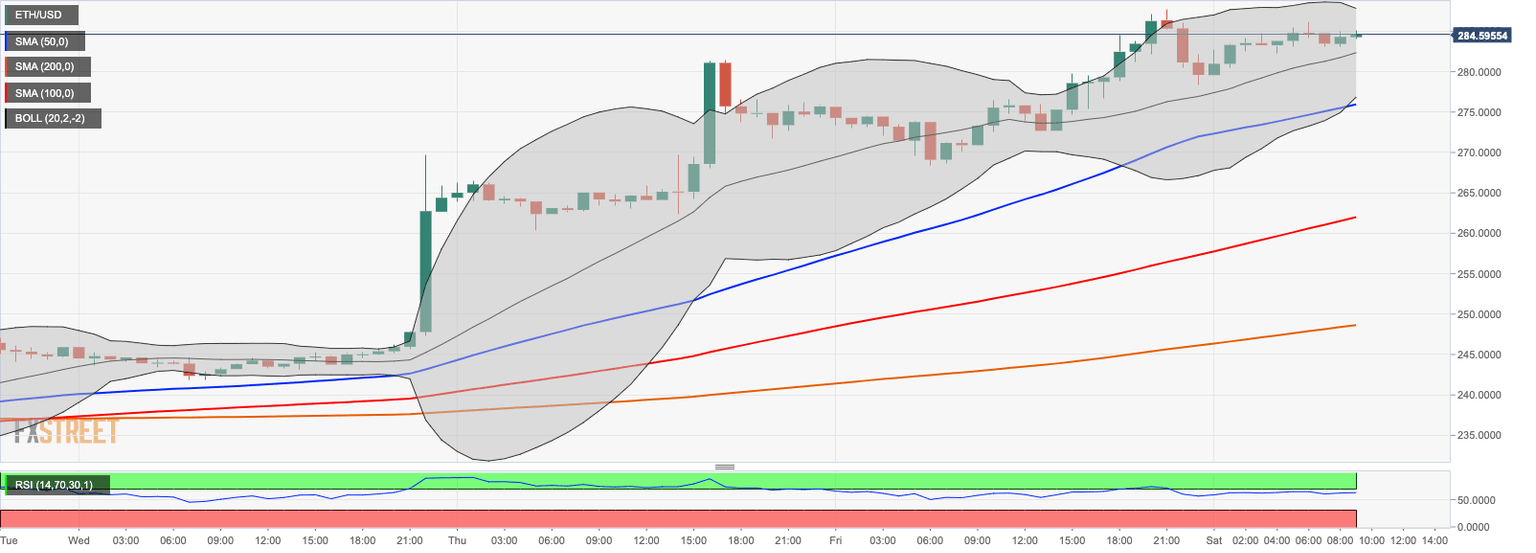 On the intraday charts, ETH/USD is moving along the upward-looking middle line of the 1-hour Bollinger Band at $282.50. A sustainable move below this line will bring $280.00 into focus. However, stronger support is created by a combination of 50-hour SMA and the lower line of the 1-hour Bollinger Band at $275.00. This area should slow down the correction.