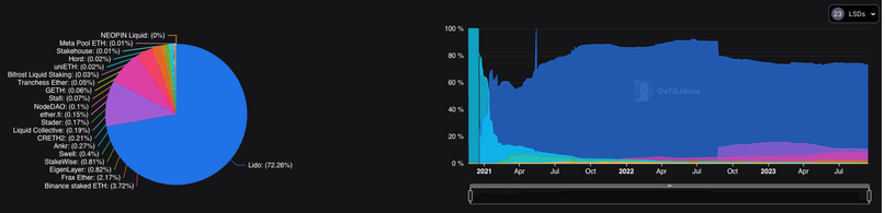 At the time of publication, Lido is by far the largest staking provider, accounting for 72% of all staked ETH.