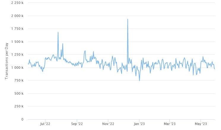 Based on Etherscan data, Ethereum daily transactions hit 968,996 on May 28, with the all-time high being 1,932,711 transactions on December 9, 2022.