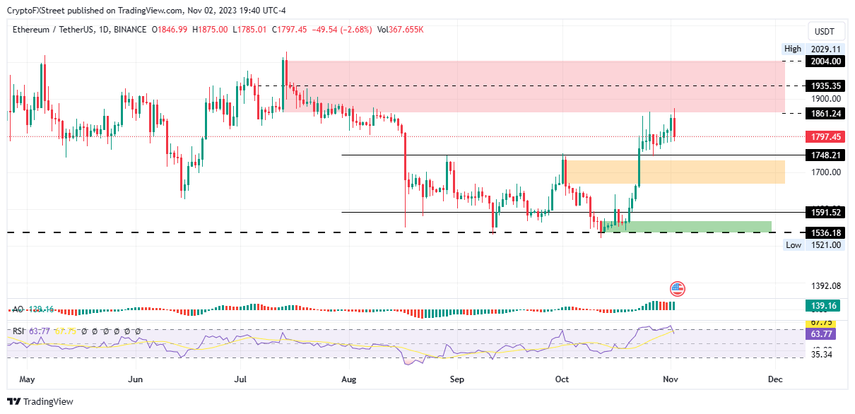 Ethereum (ETH) price is trading with a bullish bias after a 20% climb beginning in mid-October, before a rejection from the supply zone extending from $1,861 to $2,004. Noteworthy, a supply zone is an area on the chart where the price is likely to reverse due to strong opposing force. It represents an area where there is a significant concentration of selling pressure.