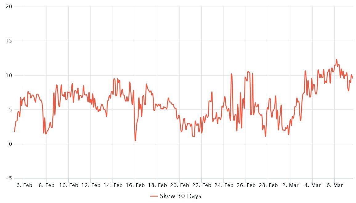 The delta skew moved above the bearish 10% threshold on March 4, signaling stress from professional traders. A brief improvement happened on March 7, although the metric continues to flirt with bearish expectations as options traders place higher costs on protective put options.