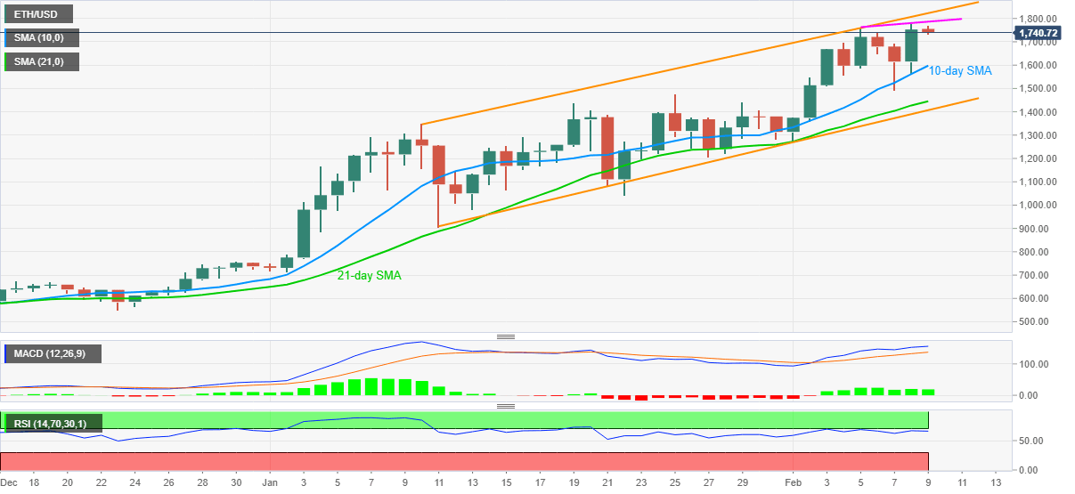 ETH/USD wavers around the mid-1,700s during early Tuesday. In doing so, the altcoin teases the record high of $1,780, flashed the previous day, inside the one-month-old rising channel.