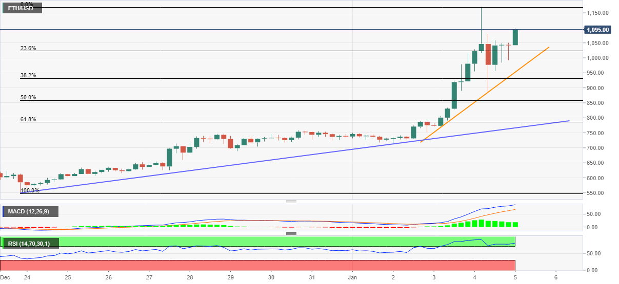 ETH/USD stays bid around $1,090 during early Tuesday’s trading. The crypto major refreshed the highest since February 2018 before stepping back to 886.00 amid overbought RSI conditions.