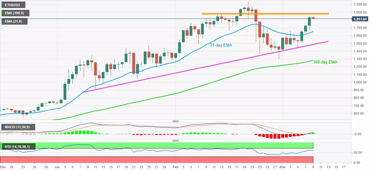Ethereum consolidates recent gains around $1,820, declining for the first time in five days, during early Tuesday. In doing so, the altcoin takes a U-turn from the highest level since February 22, also declining before the key $1,890-75 resistance area.