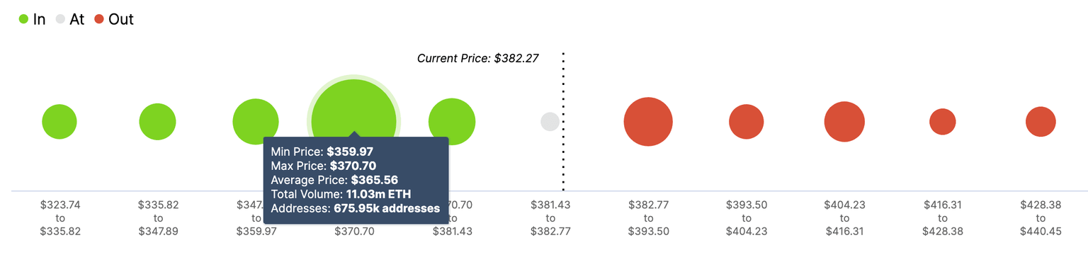 ETH positioning data confirm a strong resistance on approach to $400 as nearly 1 million addresses, with 2.49 million coins, have their breakeven point from $382 to $393. However, once this barrier turns into resistance, ETH will regain $425 posthaste as there are no severe roadblocks on the way to the North. Furthermore, ETH has reliable support on approach to $360 (657 addresses with over 11 million coins), which coincides with the lower line of the triangle pattern mentioned above.