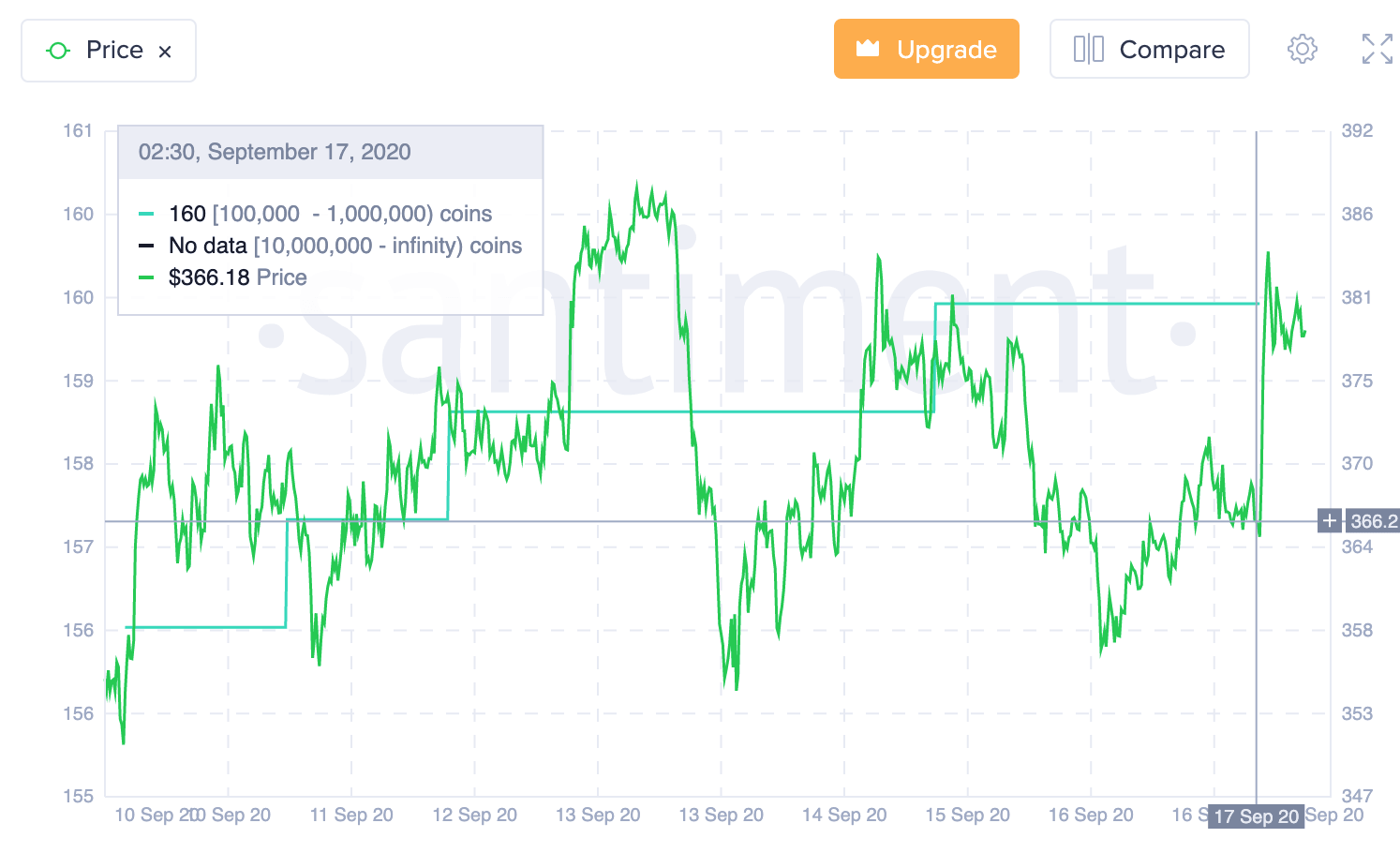 Large holders, also known as whales, usually lay flat somewhere at a depth of the market. However, once they start moving, the market may go wild. According to the data provided by the analytical service Santiment, the number of users with over 100k ETH has been growing steadily since September 11. In less than a week, their population increased from 157 to 160, meaning that big investors increased their exposure to ETH.
