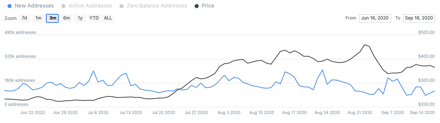 The growing number of new addresses confirms increased buying interest. The metric bottomed at 76.3k on September 14 and increased to 106.8k by September 16. Being a leading indicator for the price movements, it may signal that the upside momentum may gain traction as new network participants will start moving coins to their newly created wallets. However, we will need to make sure that the pick-up is more than a one-time thing as the ETH network is still in a shrinking mode in the long run.