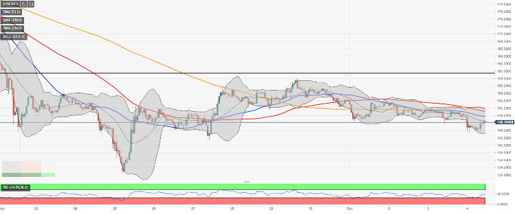 On the intraday charts, ETH/USD recovery is capped by SMA50 (Simple Moving Average) 1-hour at $147.75. We will need to see a sustainable move above this handle for the upside to gain traction with the next focus on psychological $150.00 reinforced by SMA200 1-hour. The pivotal resistance is created by $159.00. The middle line of the daily Bollinger Band and the lower boundary of the previous consolidation range will turn it into s stiff hurdle.