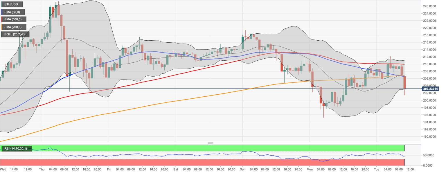 On the intraday charts, ETH/USD failed to clear the resistance created by 1-hour SMA100 on approach to $210.00. After several attempts, the price resumed the decline towards SMA50 at $206.00. A sustainable move below this barrier increased the downside pressure. Now this line serves as initial resistance. However, only a move above $210-$212 area will allow for the upside to gain traction and bring the longer-term barrier $220.00 back into focus.