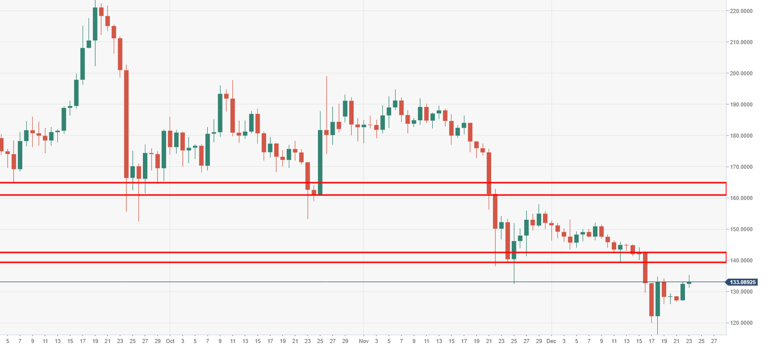 Technically, ETH/USD must break down a large barrier seen at the $140 mark, in order to gain further upside momentum. It was a strong prior acting area of support, however, bears managed to smash through this on 16 December.
