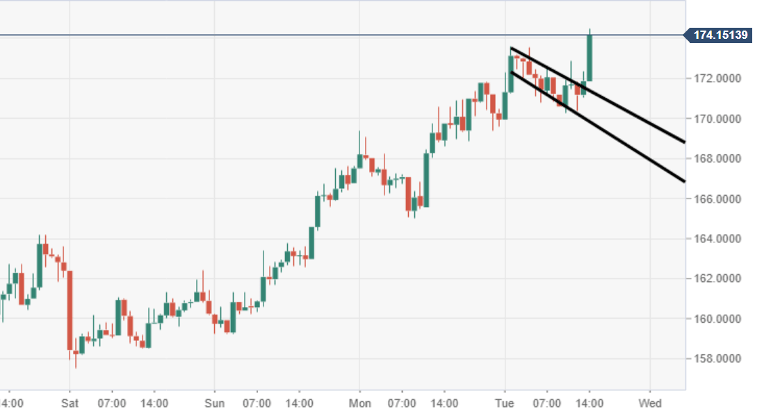The price via the 60-minute chart view has also broken out of a bullish flag, as the price moves to session highs.