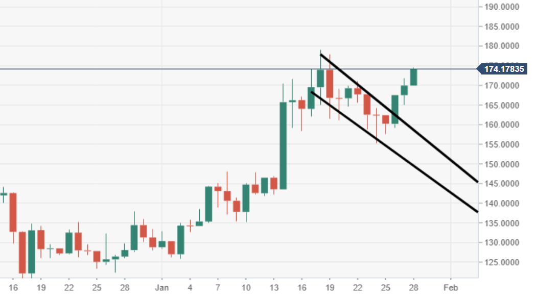 Price action is running at three consecutive sessions in the green, after smashing out from a bullish flag structure.