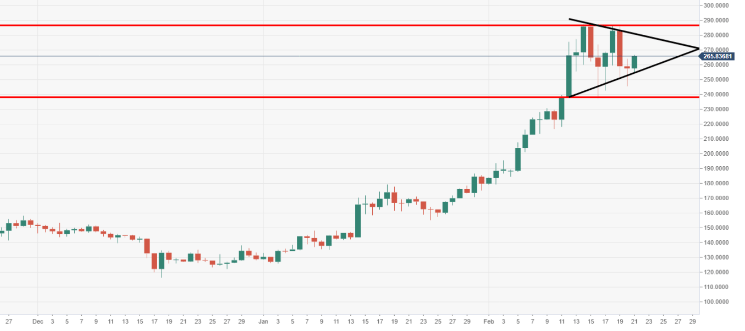 The price is narrowing, buying momentum would likely be seen upon a breakout to the upside of the top at $288, to the downside, bearish momentum would likely be seen upon a breakout of the double top formation neckline at $240-38 region.