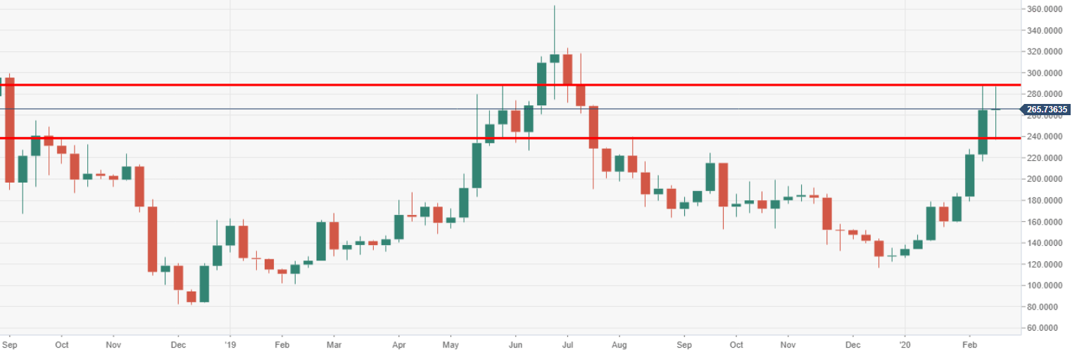 The price is stuck within a key range, $290-240, heading for a potentially negative weekly close, which if being the case could be a signal of a change in trend.