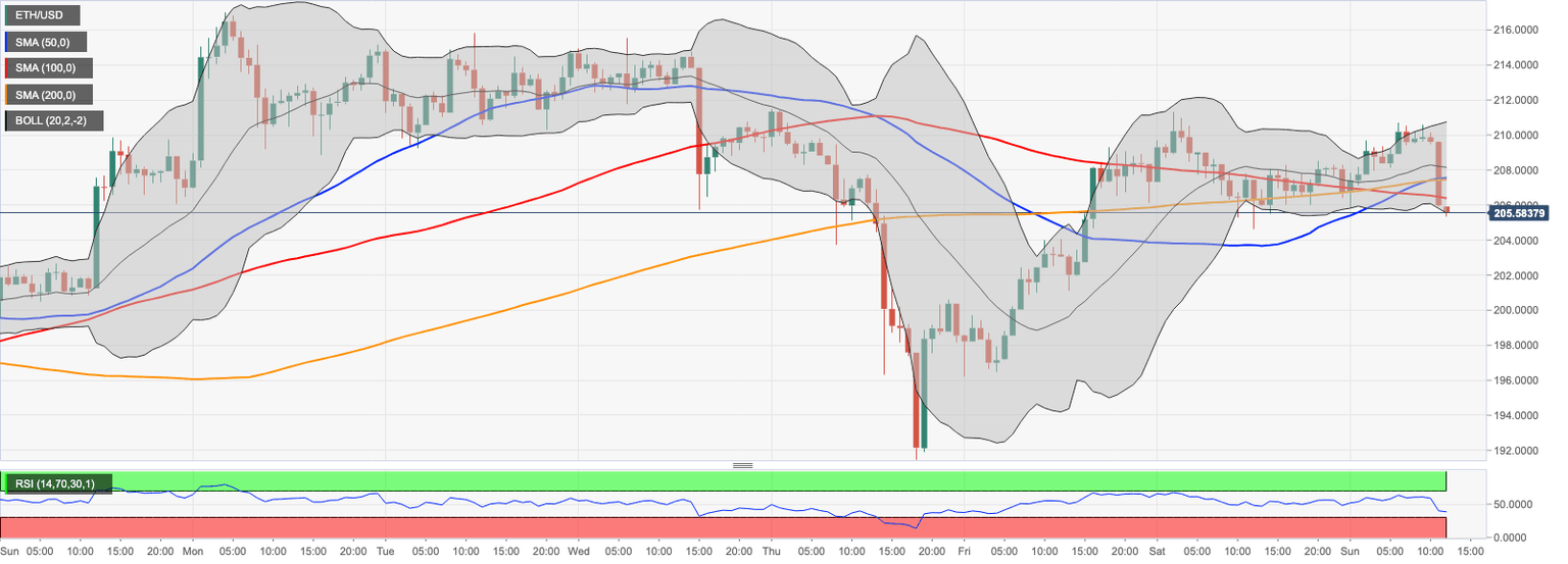 The second-largest digital asset resumed the decline and dropped from $210 to $206.00 in a matter of an hour. At the time of writing, ETH/USD is changing hands at $206.30. Despite the sell-off the price has stayed mostly unchanged both on a day-to-day basis and since the beginning of Sunday. The short-term trend is bearish, while the volatility is growing.