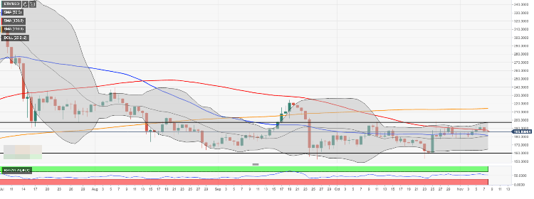 ETH/USD topped at $194.80 on November 6 and retreated to $185.98 by the time of writing. The second-largest digital asset with the current market value of $20.3 billion has lost 1.3% of its value on a day-to-day basis, following the global trends on the cryptocurrency market. While the attempts to recover above $190.00 proved to be futile, from the longer point of view, ETH/USD is moving inside a broad range.