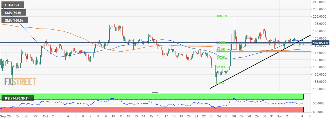 Following the break beneath the trendline support made it hard for the 61.8% Fib retracement level taken between the last high of $199.07 to a low of $152.90 support to stop the losses. Meanwhile, Ethereum is trading between the 50 Simple Moving Average (SMA) on the four-hour chart resistance and the 100 SMA support.