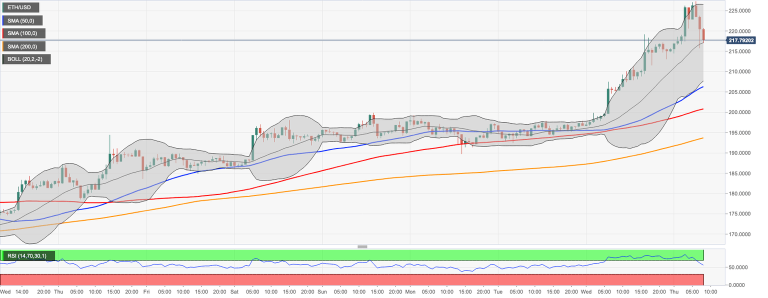 On the intraday charts, ETH/USD has settled above the middle line of the 1-hour Bollinger Band, while the RSI has exited an overbought territory and shows signs of the bearish reversal. It means that the coin is less vulnerable to the deep correction and may enter a consolidation phase in the current range limited by $218-217 on the downside and $227 on the upside. If the lower border of the range gives way, the sell-off may be extended towards 1-hour SMA50 at $206 and psychological $200.00